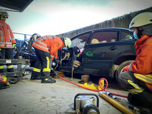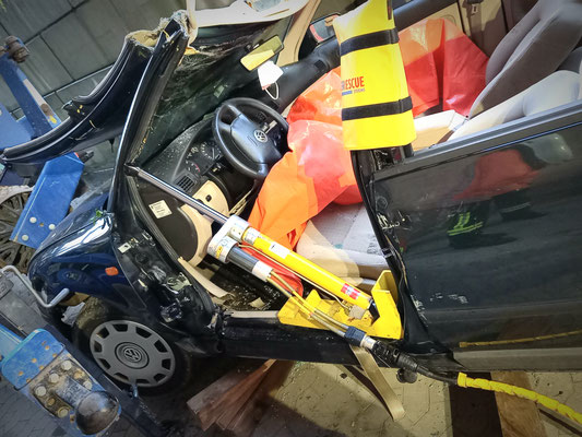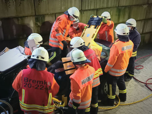 Die Einsatzkräfte fanden einen verunfallten PKW vor, in dem zwei verletze Personen saßen. Eine Person war nicht ansprechbar und musste in einer "Crashrettung", also umgehend, aus dem PKW befreit werden. Der Fahrer des Wagens war im Beinbereich massiv unter dem Armaturenbrett eingeklemmt. In Zusammenarbeit mit der Besatzung des TLF3000 aus Bremke wurde der Patient, in einer umfangreichen technischen Rettung, mittels hydraulischem Rettungsgerät aus seiner Lage befreit.