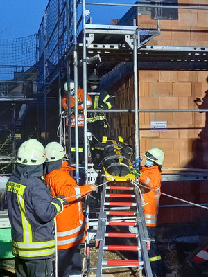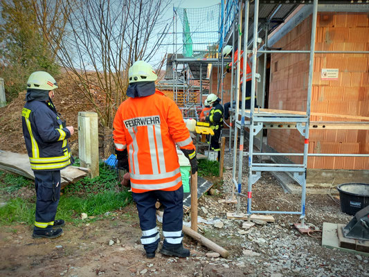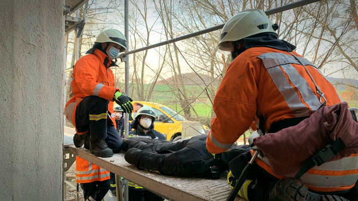 Am Freitag, den 09.04.2021, ging es um die "Patientenrettung aus exponierter Lage". Angenommen wurde ein Sturz eines Bauarbeiters vom Dach eines Rohbaus auf ein Baugerüst. Der Patient musste für den Rettungsdienst, mit Verdacht auf ein Wirbelsäulentrauma, möglichst schonend, gerettet werden. Verschiedene Möglichkeiten wurden mit den eigenen Mitteln ausprobiert sowie die Alternativen besprochen.
